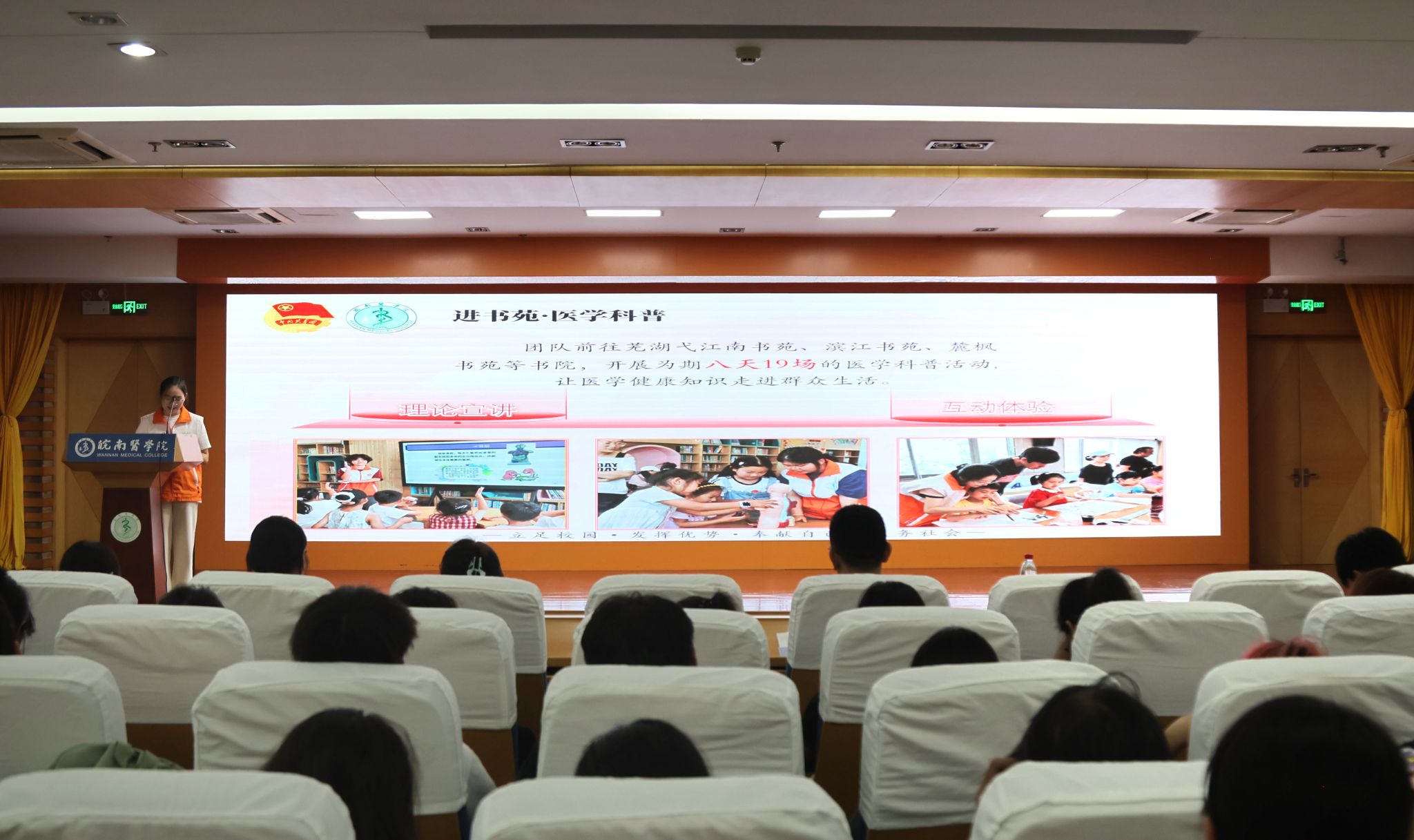 药学院“本草新语”志愿服务队以习近平总书记关于中医药工作的重要论述为遵循,聚焦“十大皖药”产业振兴,以中医药服务的“小处方”对接社会整体联动的“大处方”,助力中医药文化传承创新。医学影像学院“井冈星火”医心剧本创作团分享探寻红色文化传承创新路径,让革命故事与红医精神借剧本载体“活”在当下。临床医学院“医心”志愿服务队秉持“医学蓝”融合“党心红”,用漫画艺术唤醒耕地保护,让创意IP赋能粮食安全,以青春之名,守护中国粮安。“青马”社会实践团立足医学专业特色,回顾并讲述了在“进乡村、进社区、进书院”系列实践中,如何以“向下”的姿态扎根基层,用心、用情、用力投身实践并扣好服务健康基层“第一粒扣子”……“十佳团队”代表先后上台汇报并作经验分享,充分展现了我校青年学子以专业服务社会,以行动践行使命的生动场景。