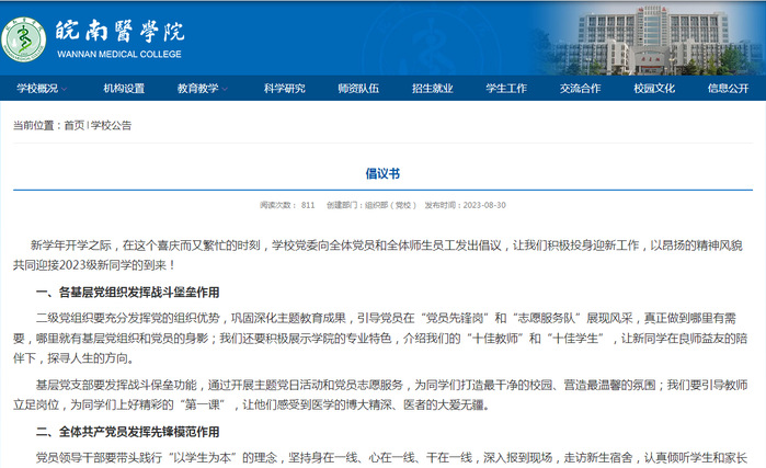 新生报到前夕,校党委面向全体党员和全体师生员工发出《倡议书》,号召各基层党组织、全体共产党员和全体师生充分发挥先进示范作用,坚持身在一线、心在一线、干在一线,积极主动参与到迎新工作中,用满腔热忱、周到服务迎接各位新同学,并陪伴他们在温暖有爱的皖医文化浸润中成长。
