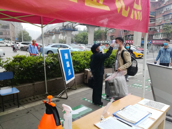 5月6日凌晨6:30,学校教职工志愿者开始装备物资,前往火车站和汽车站接站点按照接站、消毒、测温、登记、扫码等流程进行迅速布场。学生到站后,志愿者指引学生在接站点集合,并引导至测温棚进行手部消毒和体温检测。同时,负责医疗保障的志愿者观察学生有无咳嗽等相关症状。最后依次进行核验身份、登记名册和扫安康码等,跟车志愿者组织无异常情况学生依次上车,学生乘车后隔位落座、佩戴口罩、严禁交流。到站后车辆内部进行严格消毒,三天共接站70余车次。学生到校后,辅导员或学生管理人员校园入口处进行“一对一”认领,在校门口处经过身份确认、行李消毒和实名登记等流程后,学生间隔1.5米排队通过专设的测温通道。经红外线测温仪测量后,体温正常的学子带上行李正式进入校园,家长及外来无关人员、车辆一律不准入校,真正把好学生返校第一道关口。在赭麓校区和滨江校区教学楼和宿舍楼值班点,各学院工作人员第一时间向返校的学生发放体温计、口罩等防疫物资,确保学生返校后具备基本防护条件。