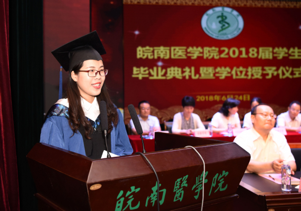 教师代表、药学院化学教研室吴运军教授对同学们表达了殷切期望,希望同学们牢记皖医精神,甘于寂寞,学会独立思考;坚守理想,敢于追求人生幸福;为人谦和,学会理解、感恩和坚强。重症护理学专业孙盼盼同学、临床医学专业庄晓鹏同学分别代表研究生和本专科毕业生发言,表达了对母校的诚挚谢意和惜别之情,表示将谨记母校校训,继承和发扬皖医精神,脚踏实地,敢于担当,奉献社会,在逐梦路上奋发向上、永不言弃,展现皖医人的风采。