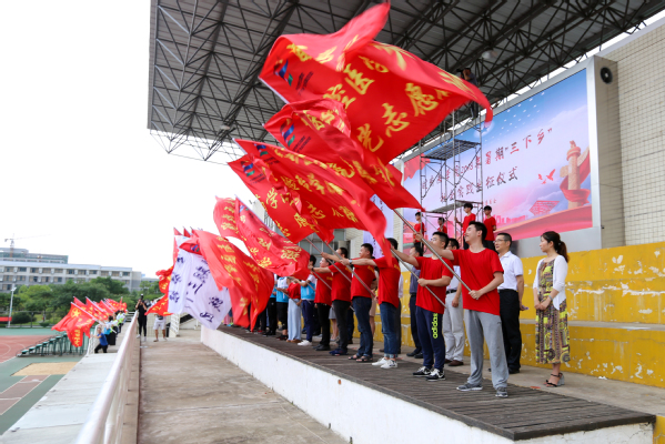 出征仪式在庄严的授旗中拉开序幕。“蚁人”、“白求恩”、“仁济”、“风信子”、“一米阳光”等18支重点立项实践团队代表走上主席台,郑重的从与会领导的手中接过鲜艳的暑期社会实践队旗。一面面承载着党组织对共青团和团员青年殷殷嘱托的社会实践团队旗帜迎风飘扬,催人奋进,彰显出皖医青年投身“青春大学习、奋进新时代”青春使命的信心和豪迈。