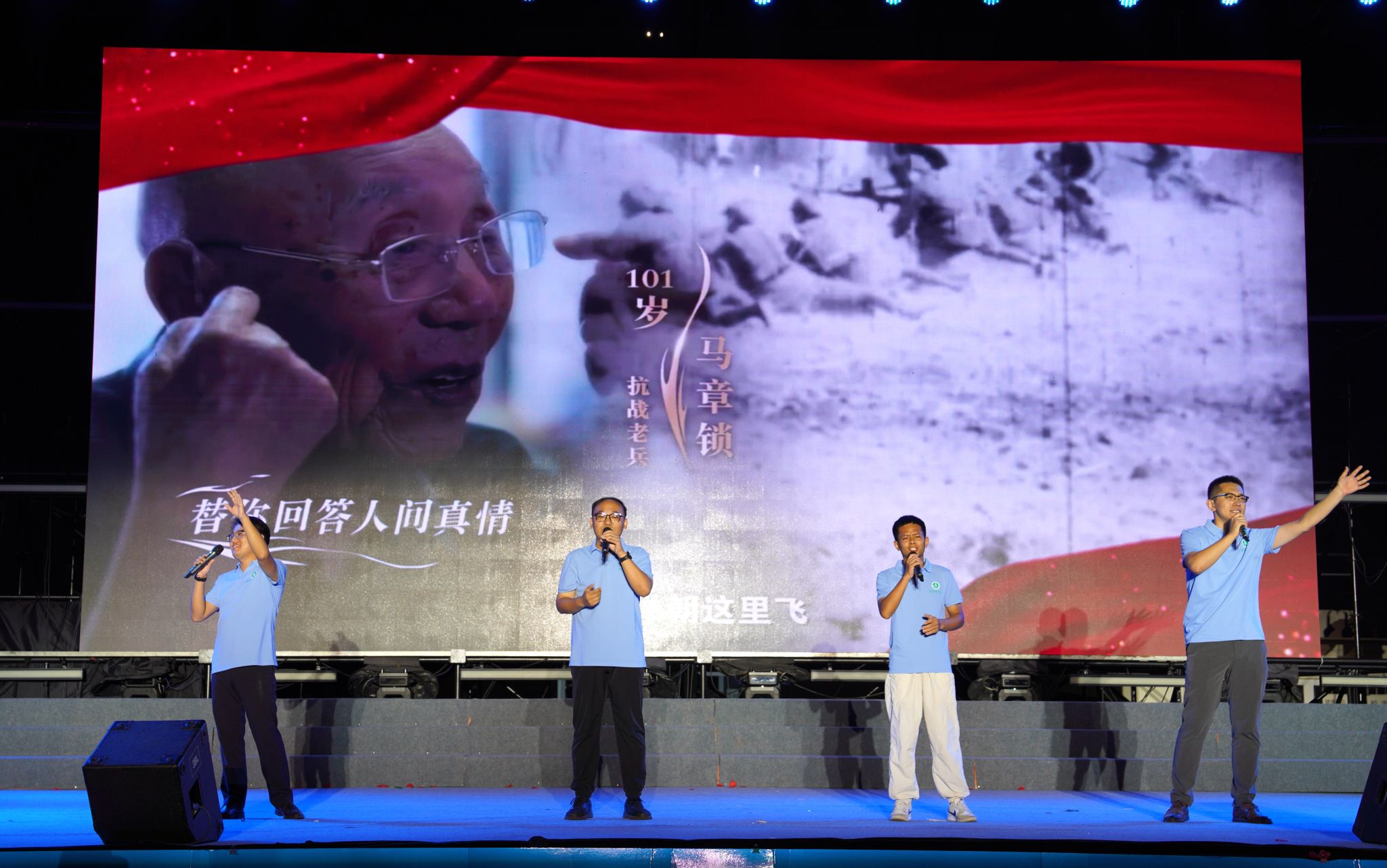 晚会在恢弘大气的开场龙鼓《旌旗半卷战九霄》中拉开帷幕;器乐合奏《就是哪吒》展现传统文化和当代精神的激情碰撞,传递“打破束缚、勇往直前”的青春无畏;军事爱好者协会带来的队列表演《钢铁洪流》刚劲有力,英姿勃发、气贯长虹,让人回想起抗战胜利80周年阅兵时的震撼场景;参加九三阅兵的两名在校退役大学生代忠意、张允乔现场分享他们通过层层选拔、经历刻苦训练,最终走到天安门阅兵现场的心路历程,一句“脚下的安宁是先辈热血换来的”让全场掌声雷动,经久不息;新生辅导员代表唱响纪念中国人民抗日战争暨世界反法西斯战争胜利80周年主题歌曲《铭记》,追忆烽火岁月,致敬伟大抗战精神,点燃在场师生心底的家国情怀,引发强烈共鸣;舞蹈《山河图》展现祖国大好河山,以今天的繁华盛世回应英雄先烈,书写这封跨越时空的家书;中外学生歌曲联唱《如是》唱出了青年人坚守初心、拼搏奋进的意气风发和追光而行,初心如炬的坚定昂扬。