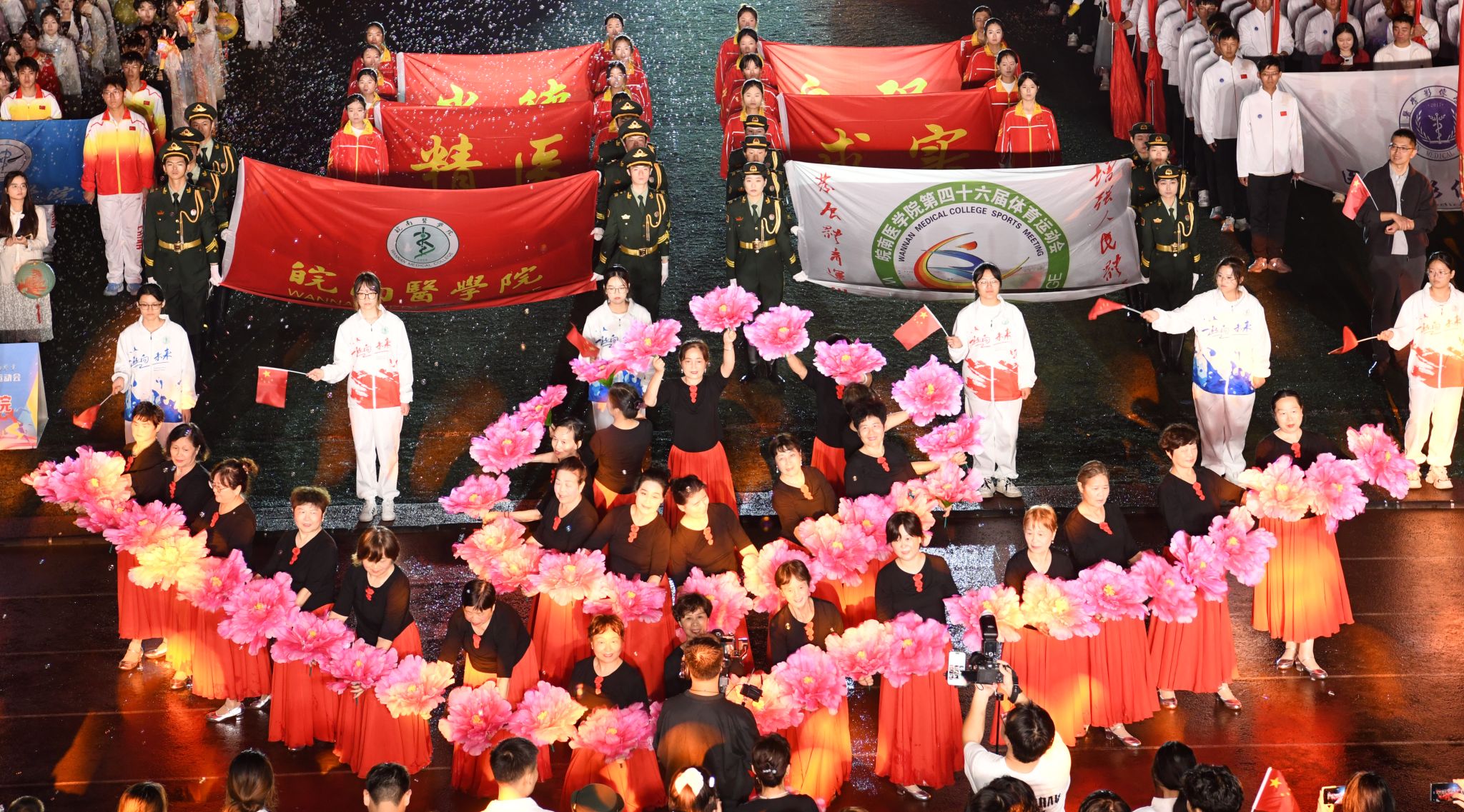 伴随着璀璨绚丽的灯光、欢快动感的旋律,精彩纷呈、声势浩大的文艺汇演让现场师生共同感受了一场力量与美感交融、青春与活力交织的视觉盛宴。此次文艺汇演分为“同心同行”“活力绽放”“共赴新程”三个篇章。鼓声激荡,直冲云霄;旗影翻飞,撼动乾坤,气势磅礴的舞蹈《旗鼓飞扬》拉开第一篇章的序幕,瞬间点燃了现场气氛。《龙狮跃鱼灯》将龙狮的磅礴威仪与鱼灯的灵动飘逸熔于一炉,把非遗传承与青春力量完美融合;主席台领导现场执笔为祥狮进行点睛,共同送上寓意深远的美好祝福。《舞动炫彩》通过彩带的灵动变幻,绽放出一朵朵绚烂的“太阳花”,展现出医学生用仁心守护每一个生命的绚烂绽放。第二篇章“活力绽放”中,《花样青春》通过“花”的生长脉络,生动勾勒大学生从青涩到成熟的成长历程,唱响“青春绽放、时代同行”的主旋律。《青春耀华夏》用“团体操+表演”的形式,结合纪念中国人民抗日战争暨世界反法西斯战争胜利80周年,激励青年学子铭记过往历史、传承红色基因。匕首操军体拳表演《利刃凌云》,将大学生的青春朝气与军人的铁血精神相融,一招一式尽显果敢与坚毅。第三篇章“共赴新程”,彰显了青年学子的爱国之情和对未来的美好祝愿。舞蹈《美丽中国》伞影婆娑,200余名学子通过伞的变化和组合拼出“我爱中国”,赤子之心跃然眼前;《旗开得胜》以旗为笔、以天地为画卷,勾勒出“旗如云、舞如风”的壮阔景象,传递着“旗开得胜”的美好寓意。《民族同心家国同辉》将56个民族的舞蹈元素与家国情怀深度融合,展现出各民族像石榴籽一样紧紧相拥的团结之美。此外,离退休老同志带来健身舞《花开中国》, 表达了老同志对祖国的无限深情和对美好生活的热爱。