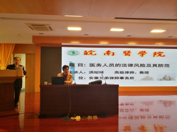 为喜迎校庆,加强我校学生对医务人员法律风险的认识,在未来职业生涯中增强风险防范意识,10月31日下午,由校庆办、科研处、马克思主义学院联合举办的学术论坛之专题报告在图书馆三楼学术报告厅举行。芜湖市政协常委、中国法学会会员、安徽省首届优秀律师洪绍球应邀作了题为“医务人员的法律风险及其防范”的报告。报告由马克思主义学院副院长陶庭马主持,200余位师生现场聆听了报告。