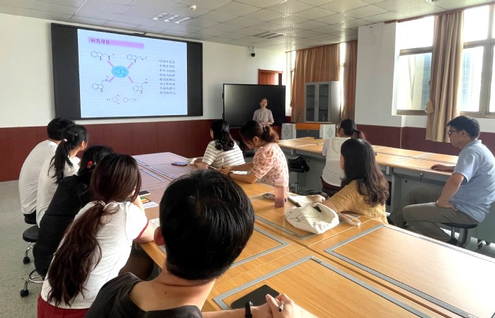 冯志君教授以“新型吲哚酰腙衍生物的合成及抗肿瘤活性研究”为题作学术报告,依次介绍了目前新型靶向药物设计中的关键靶点及其作用机制、吲哚母核衍生的靶向抗肿瘤小分子药物的研究进展和先导化合物的抗肿瘤药物设计策略,分享了课题组近期在靶向抗肿瘤小分子吲哚酰腙衍生物的设计、合成和抗肿瘤活性及作用机制研究方面的工作进展。报告结束后,冯志君教授和与会师生就报告相关内容、课题的选择与科研工作开展进行了深入交流。整场报告内容丰富,语言生动,与会师生表示受益匪浅。