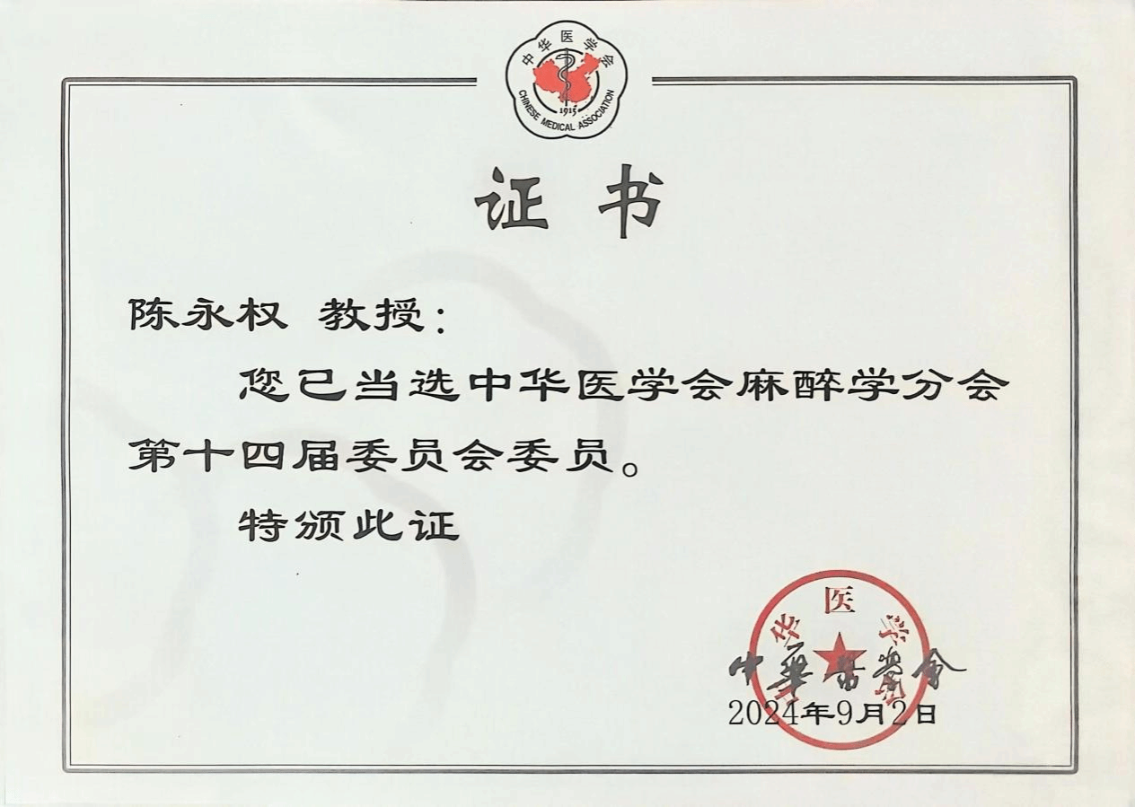 此次陈永权当选中华医学会麻醉学分会第十四届委员会委员,彰显了全国麻醉学同仁对第一附属医院麻醉学科建设及学术水平的充分肯定和普遍认可,提升了我校在全国麻醉学领域的知名度。(李万顷/文、图)