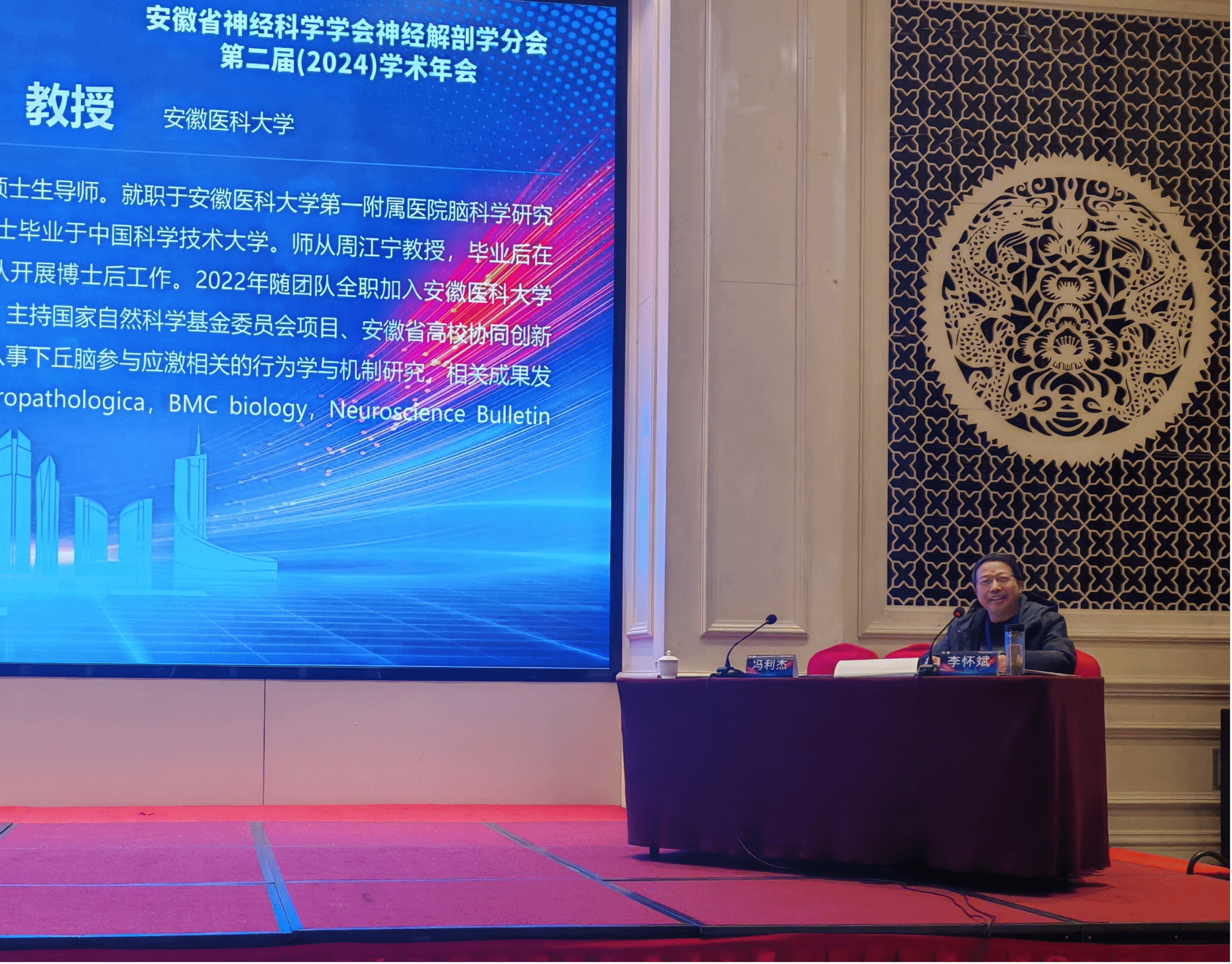 神经解剖学分会副主任委员、我校人体解剖学省级教学团队负责人李怀斌教授应邀主持上半场主旨报告及部分学术交流报告,人体解剖学教研室副主任丁见博士在大会作《高级视皮层在视觉对比度检测中的作用及其机制研究》学术交流报告。